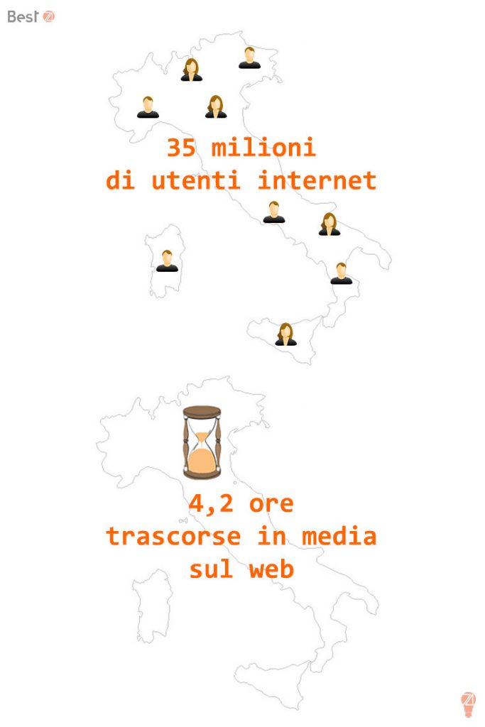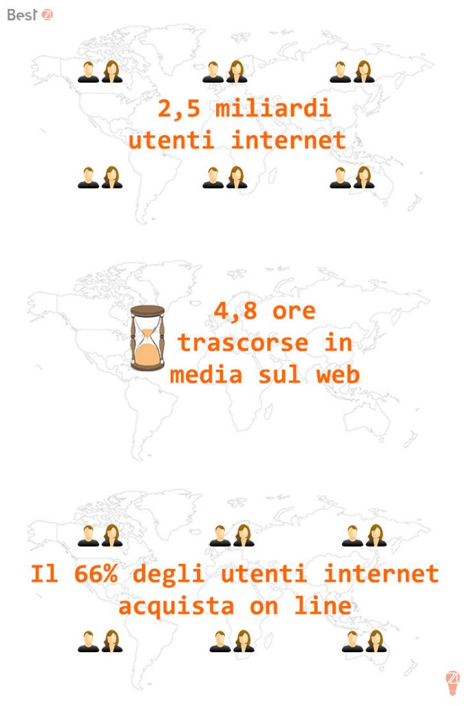 Tradotto in numeri, significa che più di 1 miliardo e mezzo di utenti acquista via internet. In Italia invece sono presenti 35 milioni di utenti attivi che trascorrono in media circa 4 ore al giorno sul web (we are social 2015).