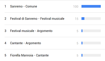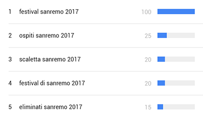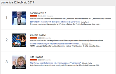 Dopo la conclusione del festival – Domenica 12 Febbraio – Sanremo 2017 – inteso come argomento – occupava le prime tre posizioni tra le tendenze nelle ricerche. Mentre come query di ricerca, occupava la prima posizione con più di 1 milione di ricerche.