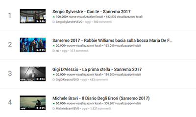 Sempre prendendo in considerazione la query di ricerca ‘Sanremo 2017‘ – che ad oggi fornisce più di 28 milioni di risultati – si riscontra che il festival è stato un argomento interessante anche durante la settimana, sia nel motore di ricerca Google che nella piattaforma Youtube. In quest’ultimo risultano centinaia di migliaia di visualizzazioni, la maggior parte delle quali riferite agli artisti in gara.