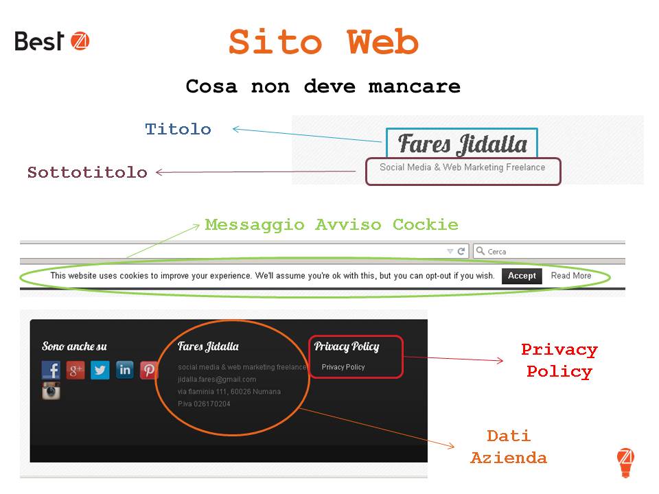 Altro tassello che non deve mancare in un sito web è il messaggio che avvisa gli utenti della presenza di cookies.